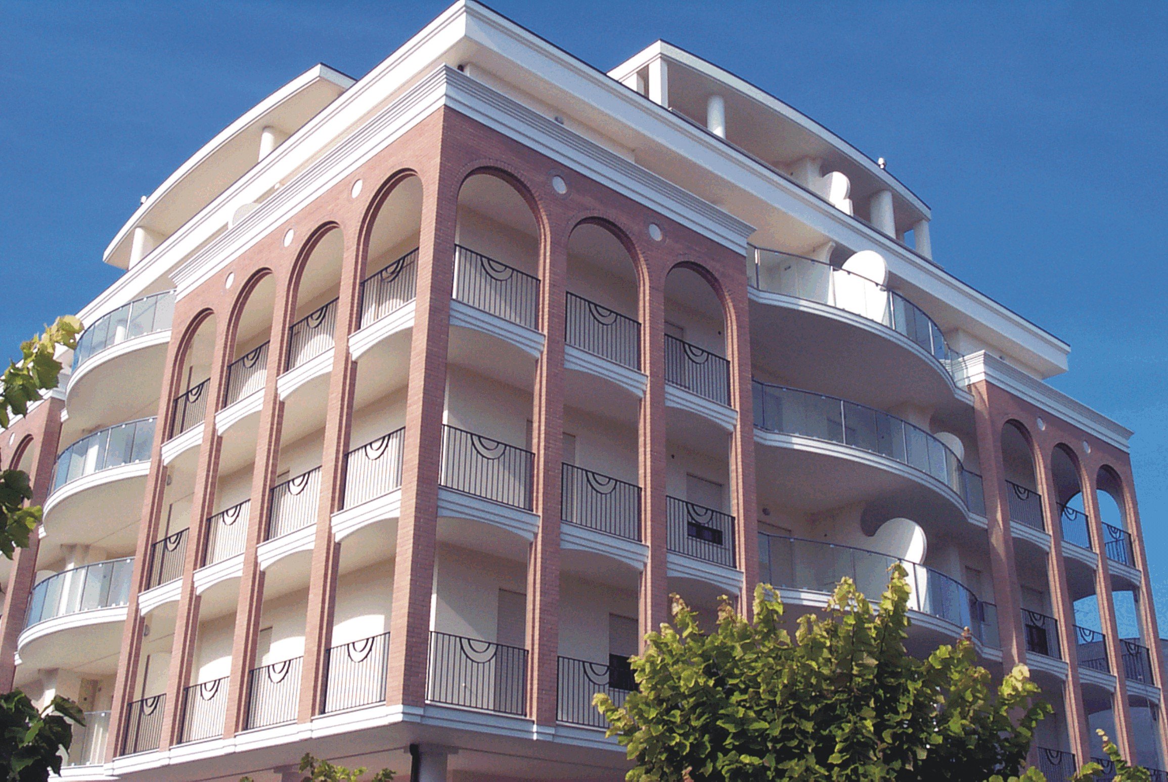 La costruzione è caratterizzata dalla presenza di 28 grandi arcate, disposte agli angoli dell’edificio e realizzate sovrapponendo due archi in mattoni, creando un senso di profondità che risalta la modernità di ogni facciata.
