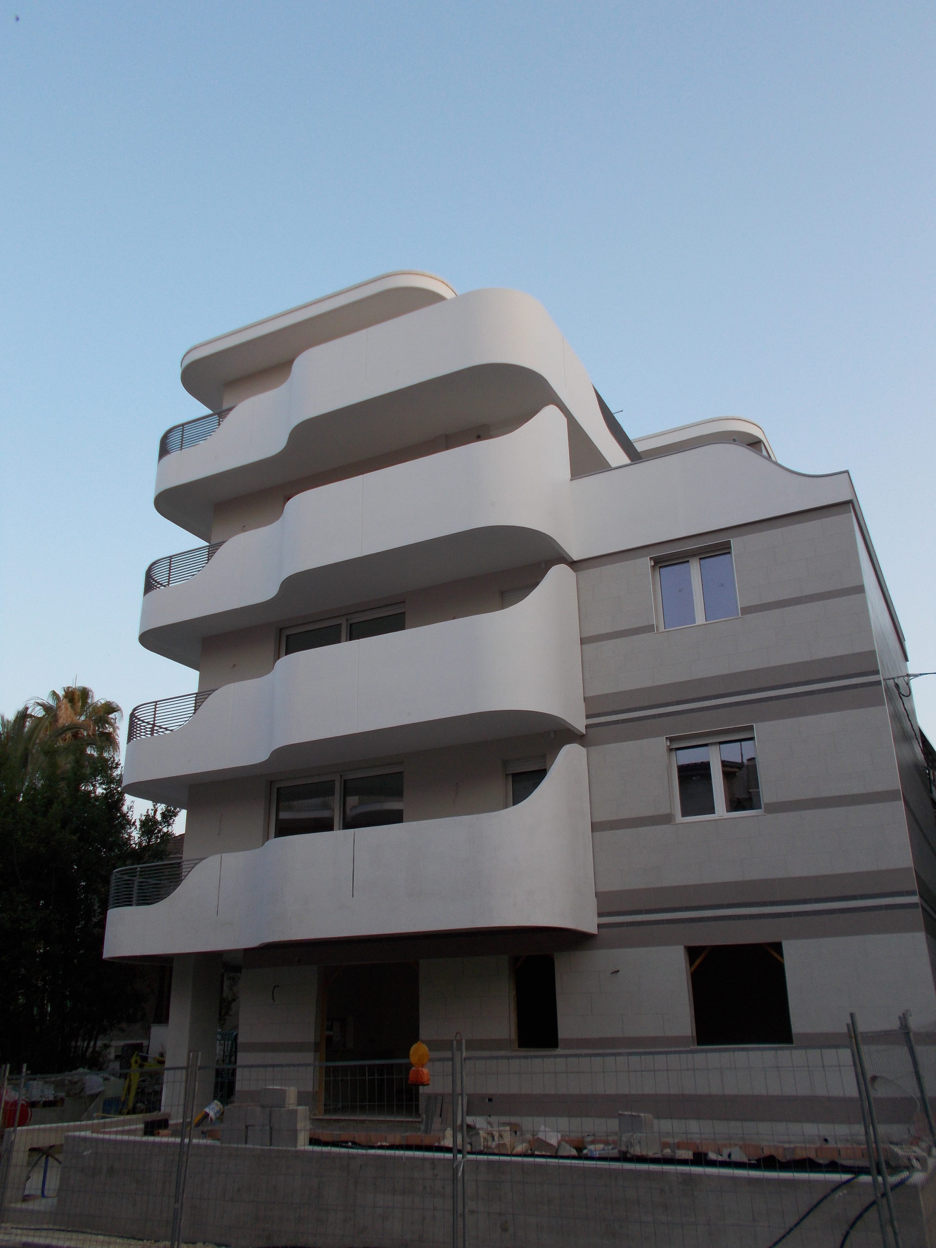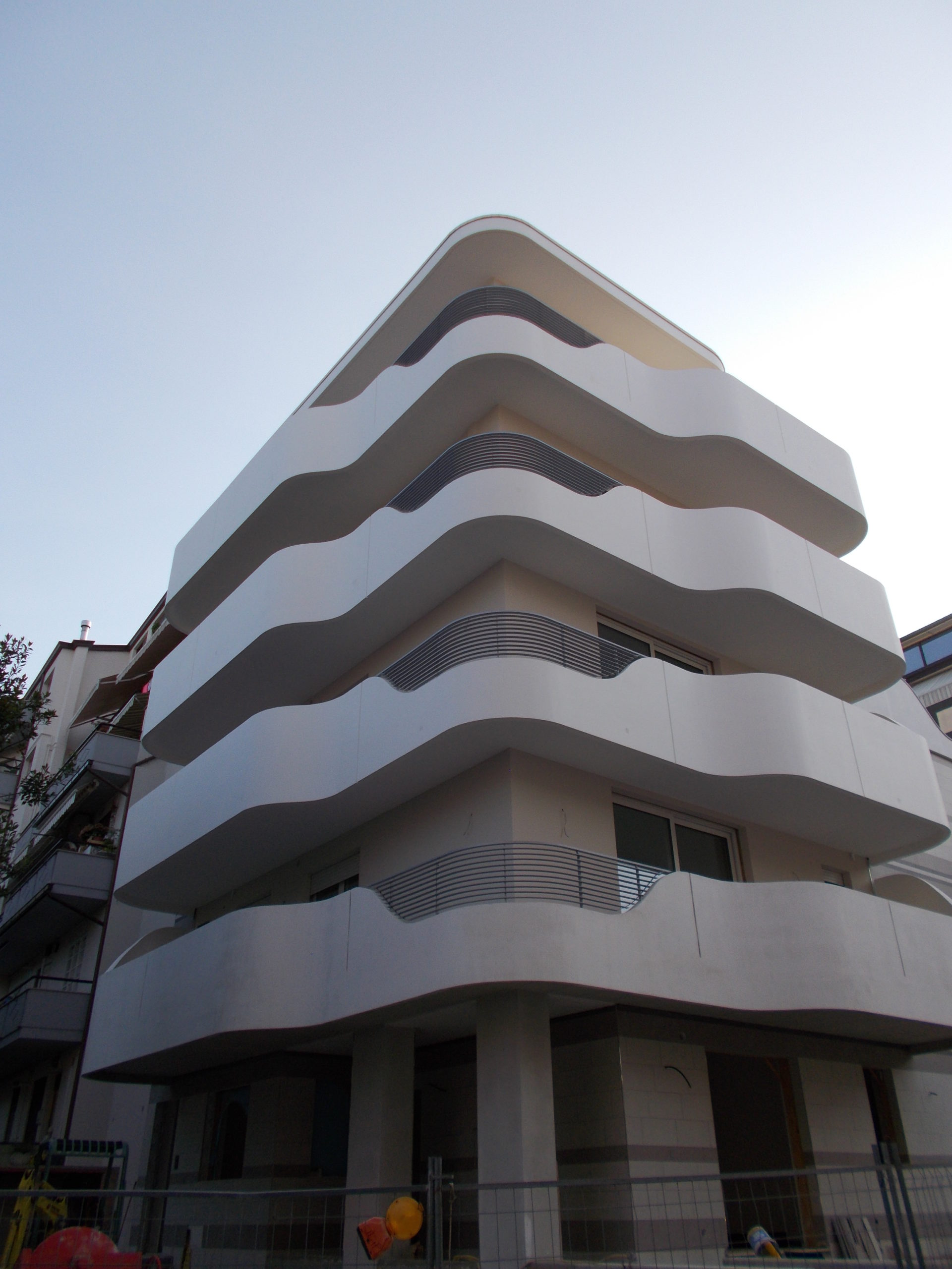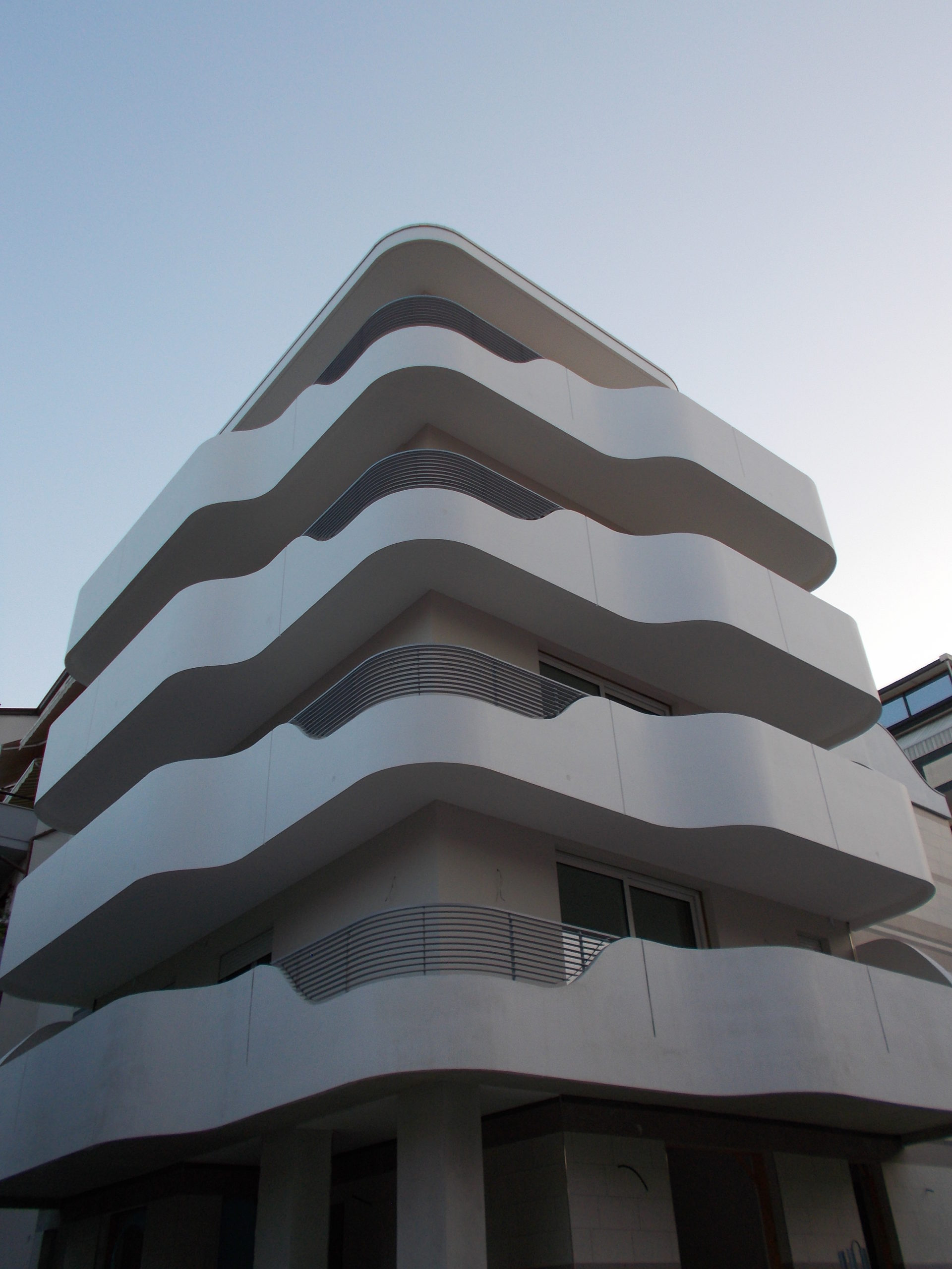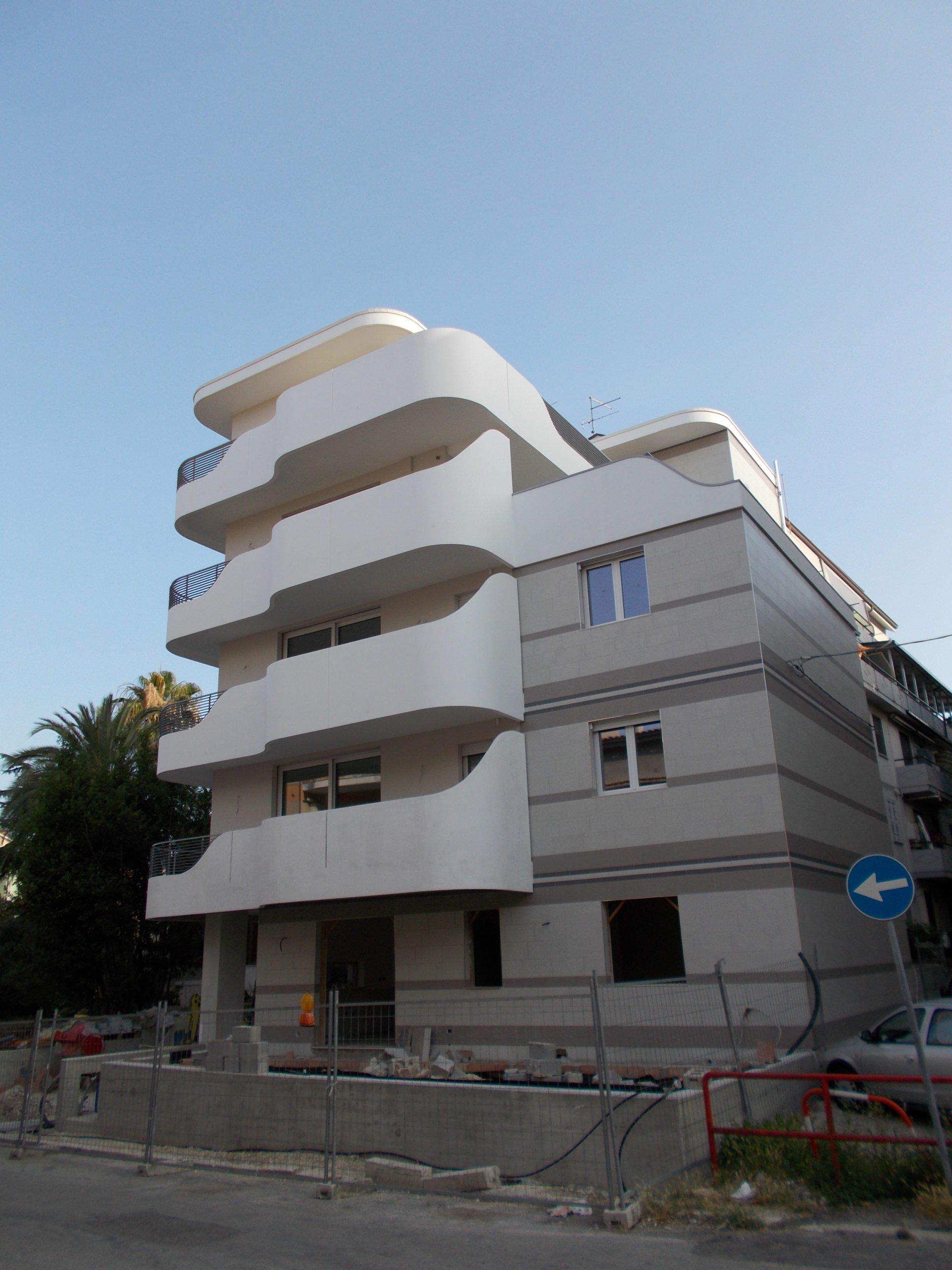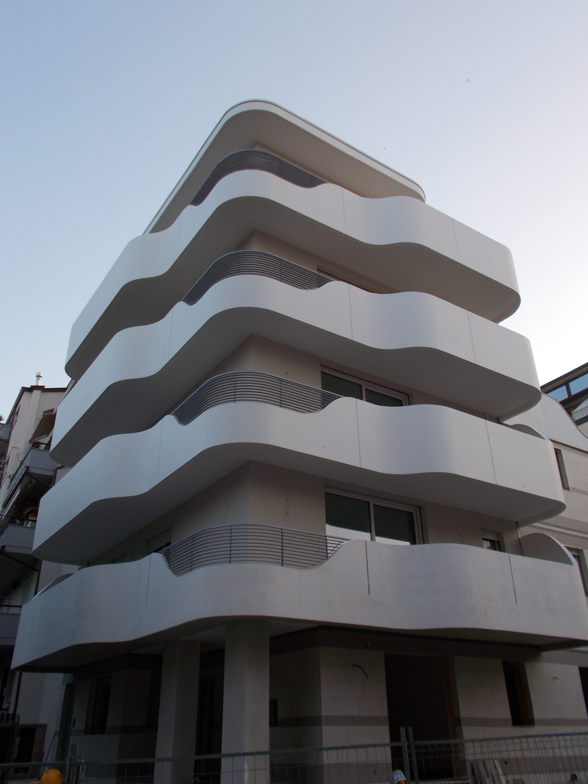 Gli aggetti (balconi) sono avvolti da velette in cemento armato flesse come fogli di carta conferendo motivo dominante al prospetto del fabbricato proiettato verso il mare. Un’insieme di “vele” che spingono Andromeda verso l’azzurro del Mare Adriatico, con un effetto ottico davvero sorprendente.